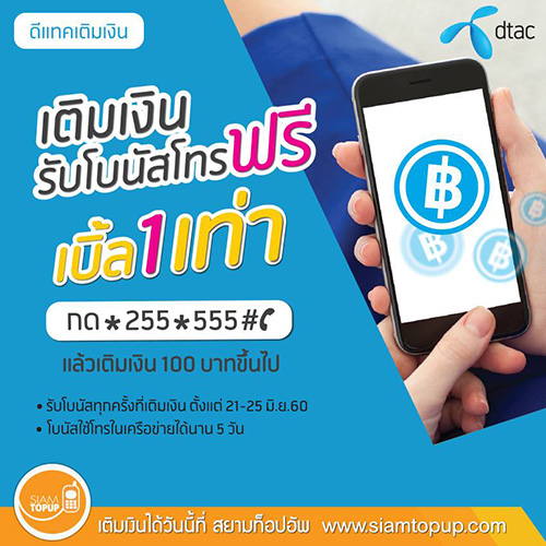 เติมเงิน Dtac 100 บาทขึ้นไป รับโบนัสโทรฟรีในเครือข่าย เบิ้ลอีก 1 เท่า ได้แล้ววันนี้ที่ Siamtopup