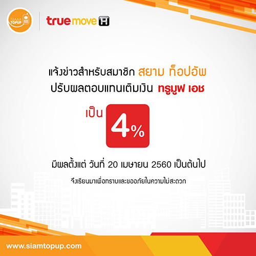 แจ้งข่าวสำหรับสมาชิก สยาม ท็อปอัพ ปรับผลตอบแทนเติมเงิน TruemoveH